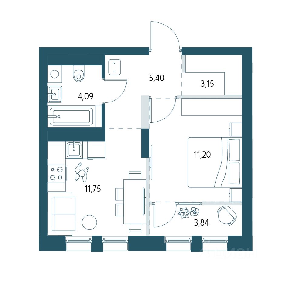 Полноценная однокомнатная квартира площадью 39,43м2.