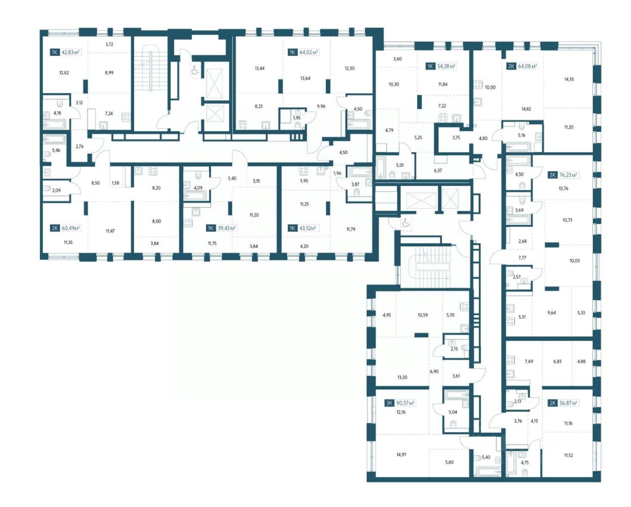 Однокомнатная квартира площадью 42,83м2.