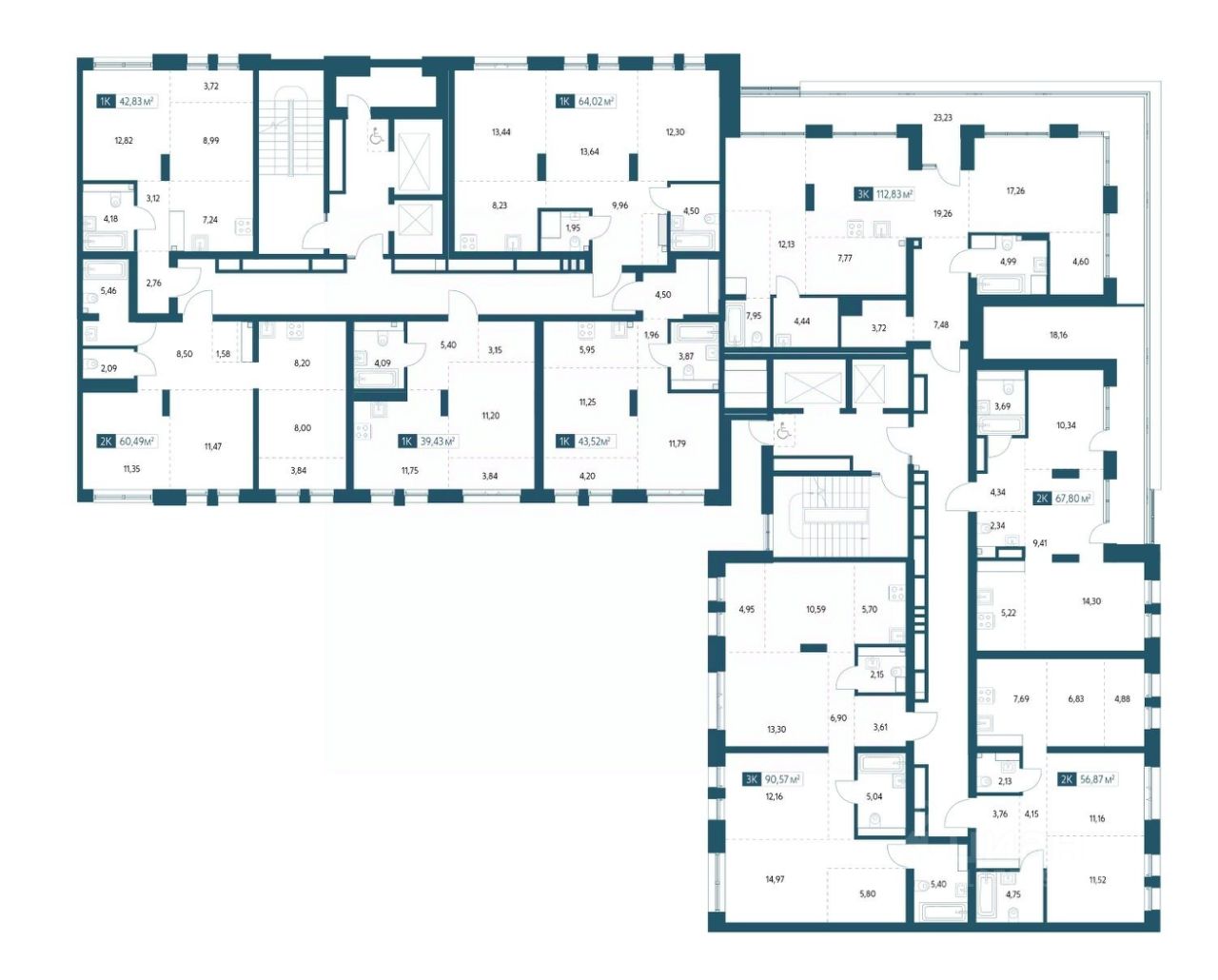 Однокомнатная квартира площадью 42,83м2.