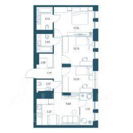 Трёхкомнатная квартира площадью 73,57м2.