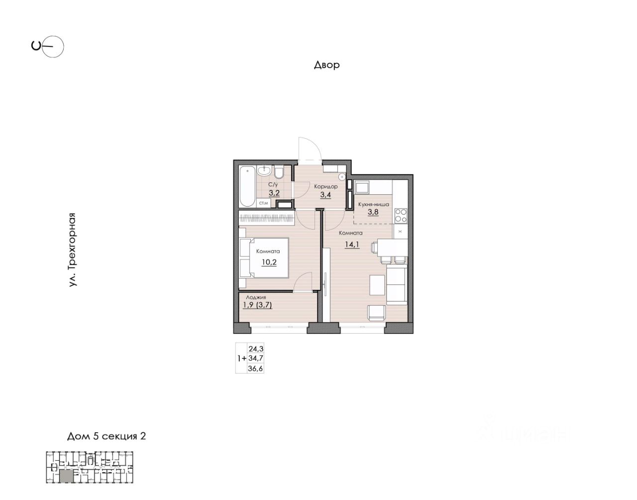 Интересная особенность - кухня-гостиная с нишей под гарнитур и возможностью установить барную стойку.