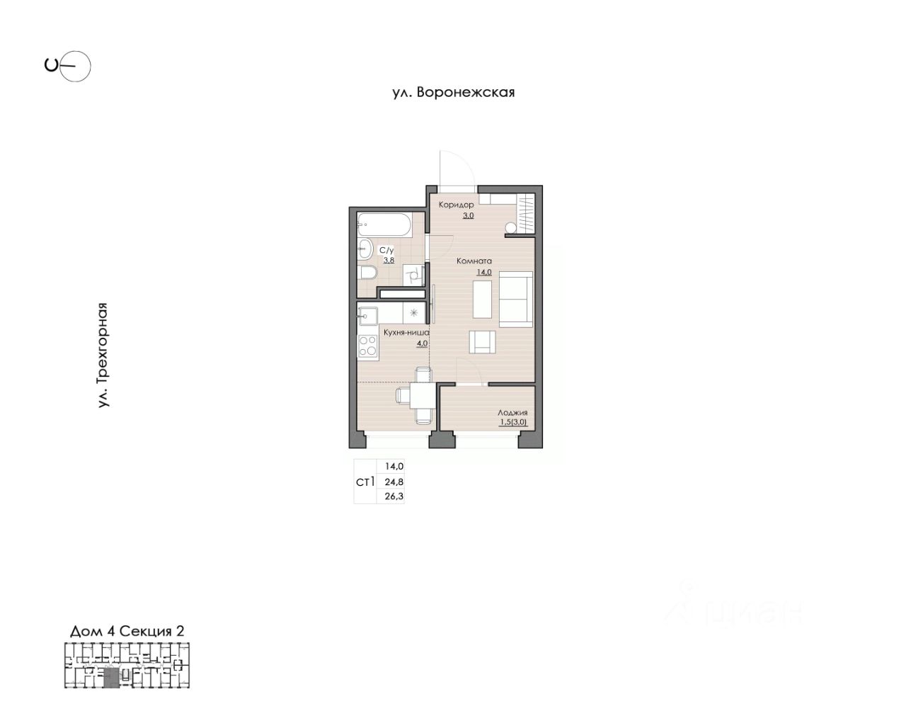 Общая площадь26,3 м²
