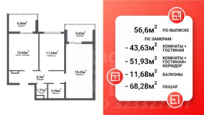 56.6м² по ЕГРН,