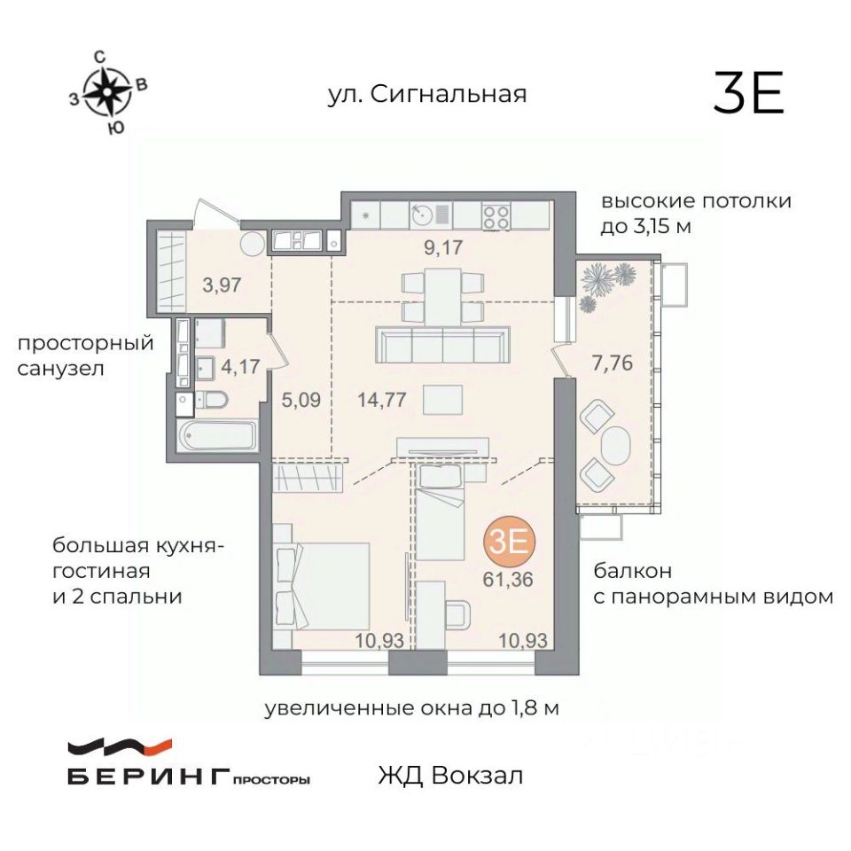 Светлая евротрешка 62 м². Здесь 2 отдельных спальни, просторная кухня-гостиная, комфортный санузел и большой балкон с панорамным видом, который можно оборудовать как зону отдыха или рабочее место.