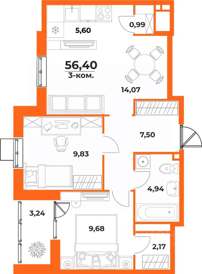 Общая площадь56,4 м²