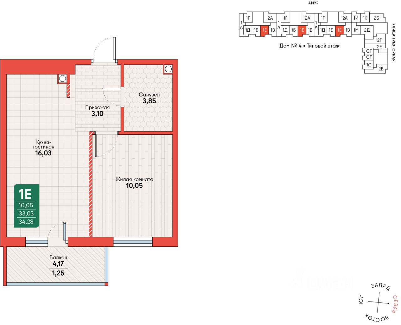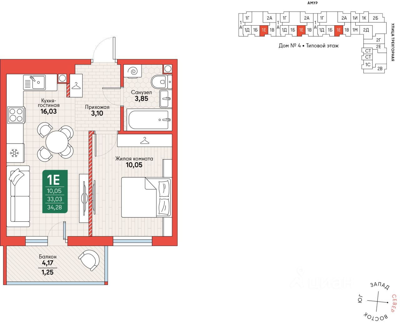 Компактная и функциональная однокомнатная квартира площадью 34,28 м², идеально подходящая для комфортного проживания одного человека.