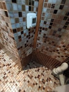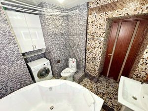 Благодаря перепланировки в квартире была увеличена ванная комната, которая вместила: большую угловую ванную и стиральную машинку и вместительный, встроенный шкаф. Всё представлено на фото. Здесь установлен теплый, электрический пол, равномерно, легко, быстро прогревающий всю поверхность. Преимущества теплых полов: