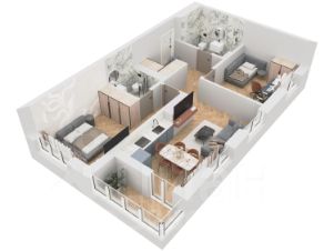 Двухкомнатная квартира евроформата для семейной пары с детьми • Просторный холл 9,6 кв.м с нишей под шкаф-купе; • Две спальных комнаты с разнесенными в противоположные части квартиры - для родителей (мастер-спальня с личным санузлом) и детей; • Кухня-столовая улучшенного формата с рабочей кухонной зоной и гостевым пространством с выходом на лоджию с угловым остеклением; • Два совмещенных санузла для обеспечения комфорта.