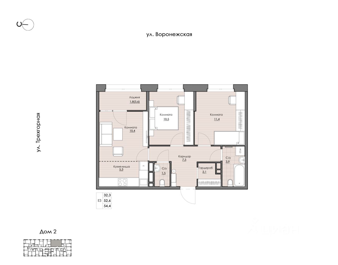 В квартире гардеробная комната, все окна выходят на ул.Воронежская.