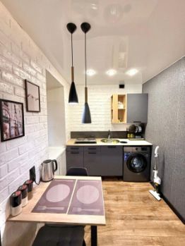 При продаже остаётся современный кухонный гарнитур, стиральная машинка, стол, стулья, шкаф, шторы, освещение во всей квартире.