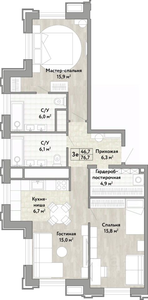 3-комн. квартира с европланировкой в ЖК "Сердце Бонивура" на 10 этаже. Квартира без отделки, после получения ключей можно делать ремонт. Общая площадь: 76.7 кв.м., жилая: 46.7 кв.м., общая площадь гостиной-столовой с кухонной зоной: 21.7 кв.м. Европланировка, кухня и гостиная объединены в одно просторное помещение. Квартира без проходных комнат, окна выходят нa три cтopoны дома. В квартире два совмещенных санузла. Высота потолков 2.85 м.