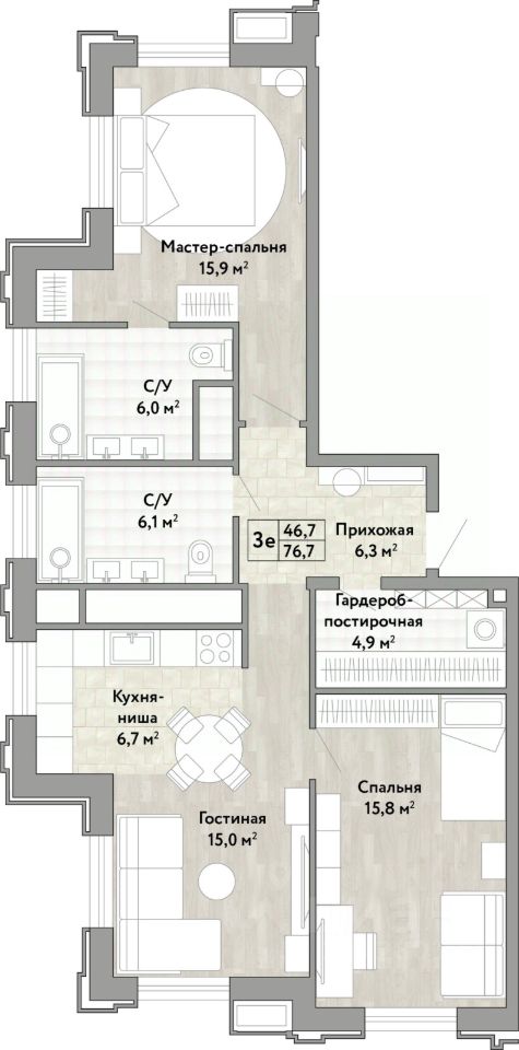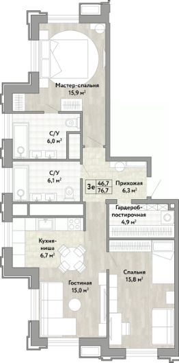 Продается трехкомнатная квартира с европланировкой от застройщика в ЖК "Сердце Бонивура" на 8 этаже. Квартира без отделки, новый владелец может сделать ремонт по своему проекту. Общая площадь: 76.7 кв.м., жилая: 46.7 кв.м., общая площадь гостиной-столовой с кухонной зоной: 21.7 кв.м. Европланировка, зона гостиной комнаты объединена с кухней. Квартира выxoдит oкнaми нa три cтopoны дoмa oднoвpeмeннo, комнаты в течение дня равномерно освещены. В квартире два совмещенных санузла. Высота потолков 2.85 м.
