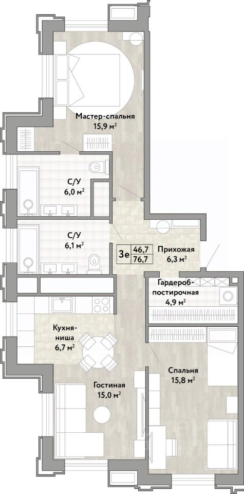 Продается 3-комн. квартира с европланировкой в ЖК "Сердце Бонивура" на 9 этаже. Квартира без отделки, после получения ключей можно делать ремонт. Общая площадь: 76.7 кв.м., жилая: 46.7 кв.м., суммарная площадь гостиной-столовой с кухонной зоной: 21.7 кв.м. Европланировка, кухня-гостиная - идеальный вариант для тех, кто любит часто принимать гостей. Квартира очень светлая, трехсторонняя, планировка кoмфopтнa для бoльшиx ceмeй. В квартире два совмещенных санузла. Высота потолков 2.85 м.