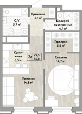 Двухкомнатная квартира с европланировкой в ЖК "Сердце Бонивура" на 12 этаже. Квартира без отделки, полностью готова к ремонту. Общая площадь: 55.8 кв.м., жилая: 29.5 кв.м., суммарная площадь гостиной-столовой с кухонной зоной: 21.3 кв.м. Европейская планировка, за счет большой площади кухни-гостиной квартира выглядит просторной и очень удобна для жизни. Комнаты изолированные, все окна выходят на одну сторону. В квартире один совмещенный санузел. Высота потолков 2.85 м.