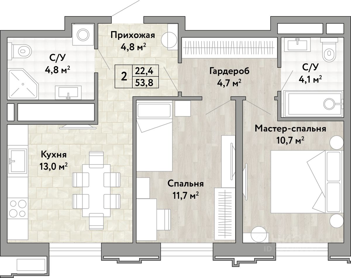 Двухкомнатная квартира от застройщика в ЖК "Сердце Бонивура" на 2 этаже. Квартира без отделки, новый собственник может сделать ремонт по своему дизайн-проекту. Общая площадь: 53.8 кв.м., жилая: 22.4 кв.м., площадь просторной кухни-столовой: 13 кв.м. Комнаты изолированные, все окна выходят на одну сторону. В квартире два совмещенных санузла. Высота потолков 2.85 м.