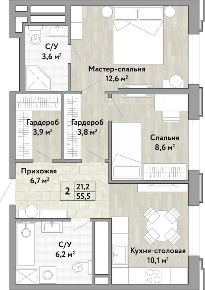2-комн. квартира в ЖК "Сердце Бонивура" на 12 этаже. Квартира без отделки, полностью готова к чистовой отделке и дальнейшему ремонту. Общая площадь: 55.5 кв.м., жилая: 21.2 кв.м., площадь просторной кухни-столовой: 10.1 кв.м. Комнаты изолированные, все окна выходят на одну сторону. В квартире два совмещенных санузла. Высота потолков 2.85 м.
