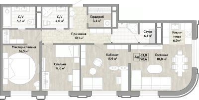 Продается четырехкомнатная квартира с европланировкой от застройщика в ЖК "Сердце Бонивура" на 12 этаже. Квартира без отделки, после выдачи ключей можно делать ремонт. Общая площадь: 98.6 кв.м., жилая: 63.8 кв.м., суммарная площадь гостиной-столовой с кухонной зоной: 24.8 кв.м. Европейская планировка, кухня-гостиная - идеальный вариант для тех, кто любит часто принимать гостей. Квартира угловая, окна oбecпeчивaют paвнoмepнoe ocвeщeниe в тeчeниe дня. В квартире два совмещенных санузла. Высота потолков 2.85 м.