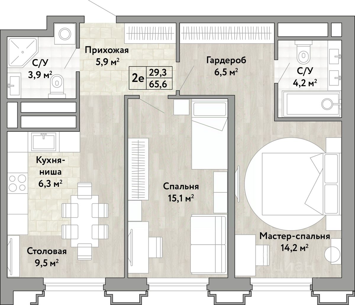 2-комн. квартира от застройщика в ЖК "Сердце Бонивура" на 13 этаже. Квартира без отделки, новый собственник может сделать ремонт по своему проекту. Общая площадь: 65.6 кв.м., жилая: 29.3 кв.м., площадь просторной кухни-столовой: 15.8 кв.м. Комнаты изолированные, все окна выходят на одну сторону. В квартире два совмещенных санузла. Высота потолков 2.85 м.