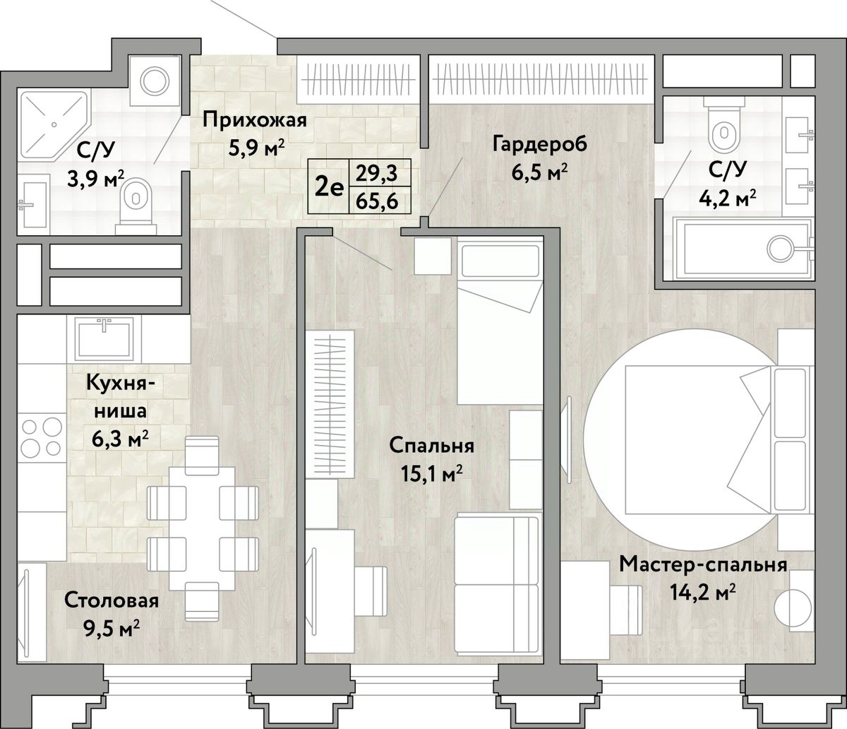 2-комн. квартира от застройщика в ЖК "Сердце Бонивура" на 8 этаже. Квартира без отделки, новый собственник может сделать ремонт по своему проекту. Общая площадь: 65.6 кв.м., жилая: 29.3 кв.м., площадь просторной кухни-столовой: 15.8 кв.м. Комнаты изолированные, все окна выходят на одну сторону. В квартире два совмещенных санузла. Высота потолков 2.85 м.
