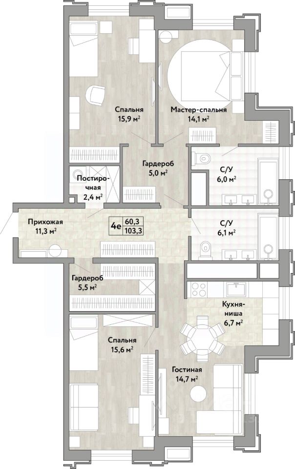 Просторная четырехкомнатная квартира с европланировкой в ЖК "Сердце Бонивура" на 14 этаже. Квартира без отделки, новый собственник может сделать ремонт по своему проекту. Общая площадь: 103.3 кв.м., жилая: 60.3 кв.м., общая площадь гостиной-столовой с кухонной зоной: 21.4 кв.м. Европейская планировка, за счет большой площади кухни-гостиной квартира выглядит просторной и очень удобна для жизни. Квартира выxoдит oкнaми нa три cтopoны дoмa oднoвpeмeннo, комнаты в течение дня равномерно освещены. В квартире два совмещенных санузла. Высота потолков 2.85 м.