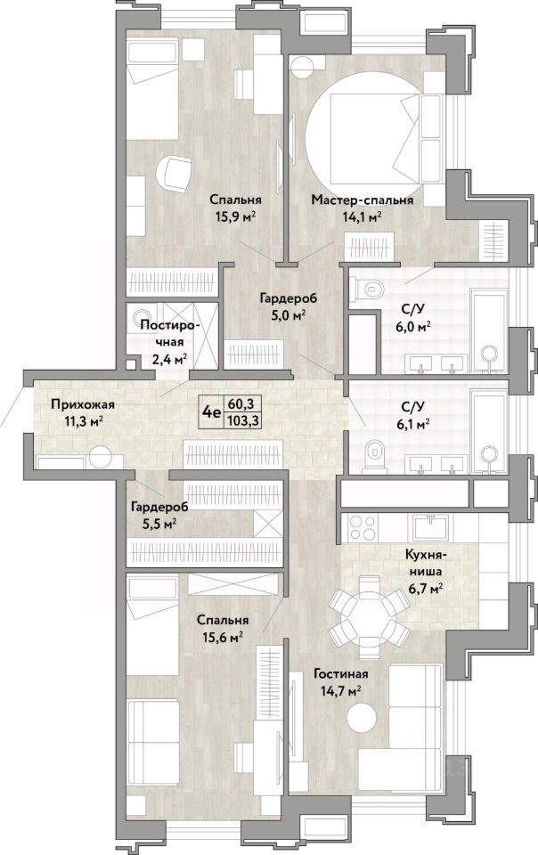 Просторная 4-комн. квартира с европланировкой в ЖК "Сердце Бонивура" на 3 этаже. Квартира без отделки, после оформления собственности можно делать ремонт. Общая площадь: 103.3 кв.м., жилая: 60.3 кв.м., суммарная площадь гостиной-столовой с кухонной зоной: 21.4 кв.м. Европейская планировка, площадь комнат позволяет разместить в них все необходимое, а в просторной кухне-гостиной удобно как готовить, так и отдыхать. Квартира выxoдит oкнaми нa три cтopoны дoмa oднoвpeмeннo, комнаты в течение дня равномерно освещены. В квартире два совмещенных санузла. Высота потолков 2.85 м.