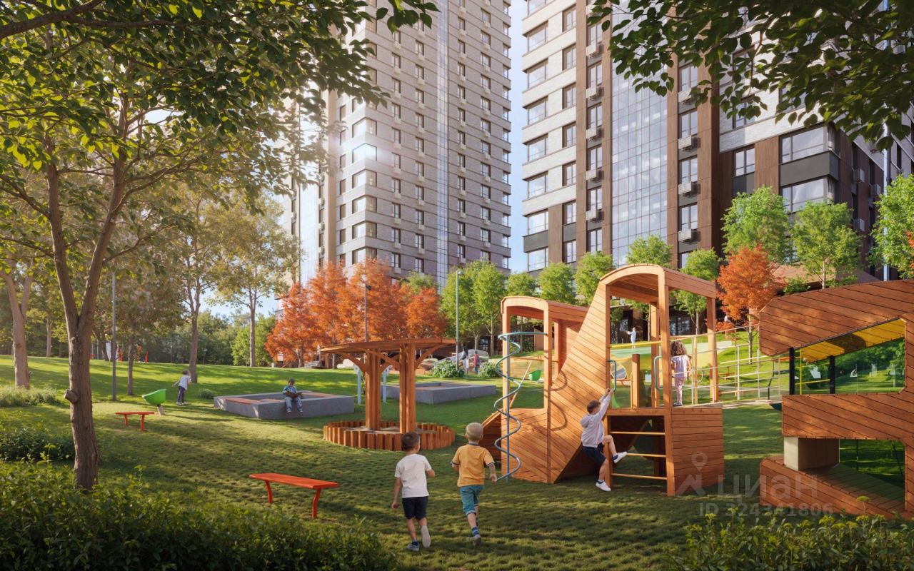 Дети постарше лазают по современному игровому комплексу или катаются на памп-треке — отвлекаясь от гаджетов и не выходя за территорию ЖК.