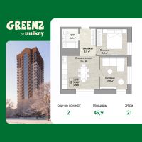 Просторная 2-комн. квартира в ЖК "Green 2" на 21 этаже. Квартира без отделки, новый владелец может сделать ремонт по индивидуальному проекту. Общая площадь: 49.9 кв.м., жилая: 23 кв.м., площадь просторной кухни-столовой: 16.7 кв.м. Угловая квартира, очень светлая, естественная вентиляция при открытии окон. В квартире один совмещенный санузел. Высота потолков 2.7 м.