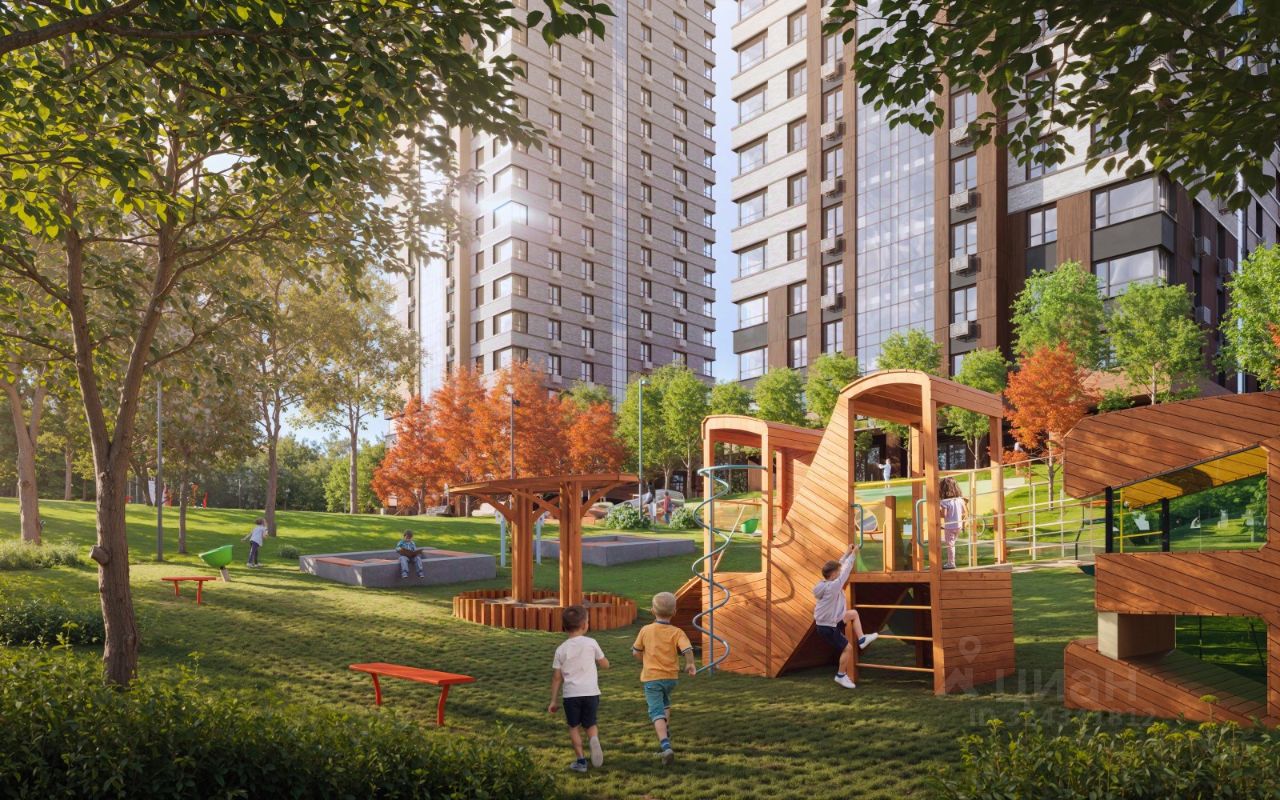 Дети постарше лазают по современному игровому комплексу или катаются на памп-треке — отвлекаясь от гаджетов и не выходя за территорию ЖК.