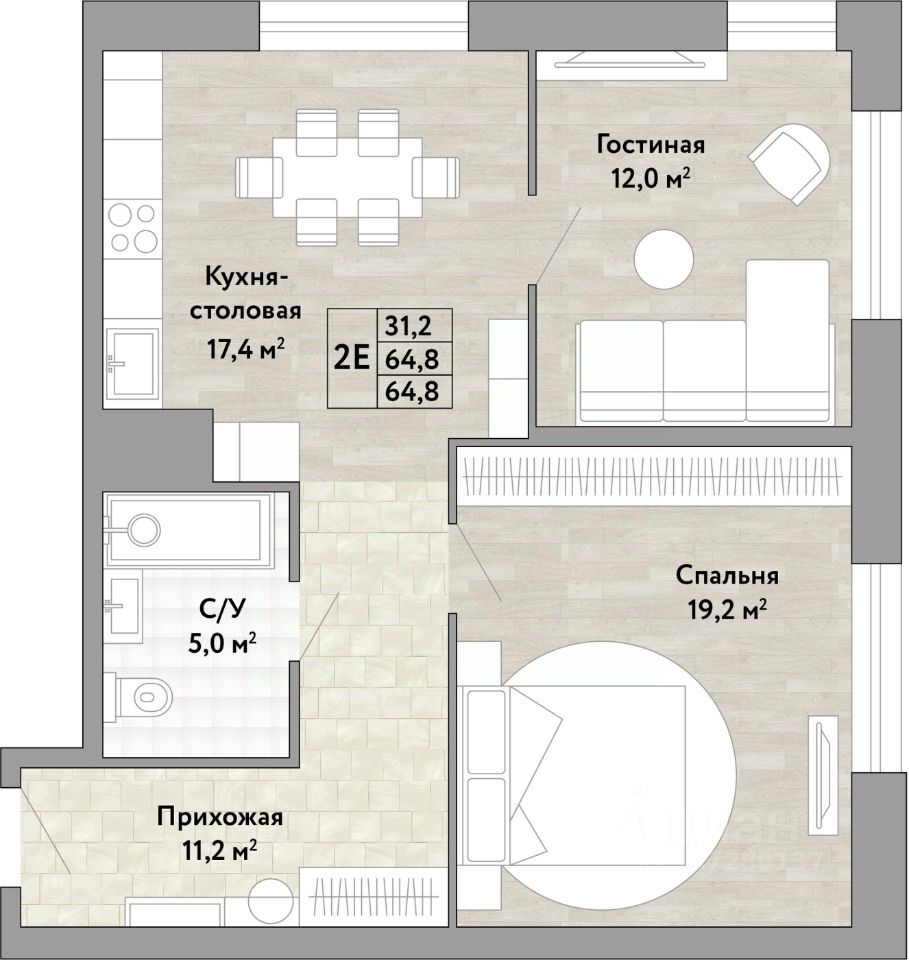 2-комн. квартира от застройщика в ЖК "Green 2" на 12 этаже. Квартира без отделки, после получения ключей можно делать ремонт. Общая площадь: 64.8 кв.м., жилая: 31.2 кв.м., площадь просторной кухни-столовой: 17.4 кв.м. Квартира угловая, идеально подойдет любителям тишины и панорамных видов. В квартире один совмещенный санузел. Высота потолков 2.7 м.