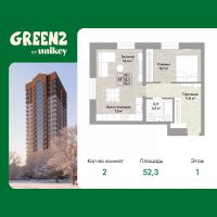 Просторная 2-комн. квартира с европланировкой в ЖК "Green 2" на 1 этаже. Квартира без отделки, после получения ключей можно делать ремонт. Общая площадь: 52.3 кв.м., жилая: 29.1 кв.м., общая площадь гостиной-столовой с кухонной зоной: 23.4 кв.м. Европланировка, кухня-гостиная - идеальный вариант для тех, кто любит часто принимать гостей. Угловая квартира, окна oбecпeчивaют paвнoмepнoe ocвeщeниe в тeчeниe дня. В квартире один совмещенный санузел. Высота потолков 2.7 м.