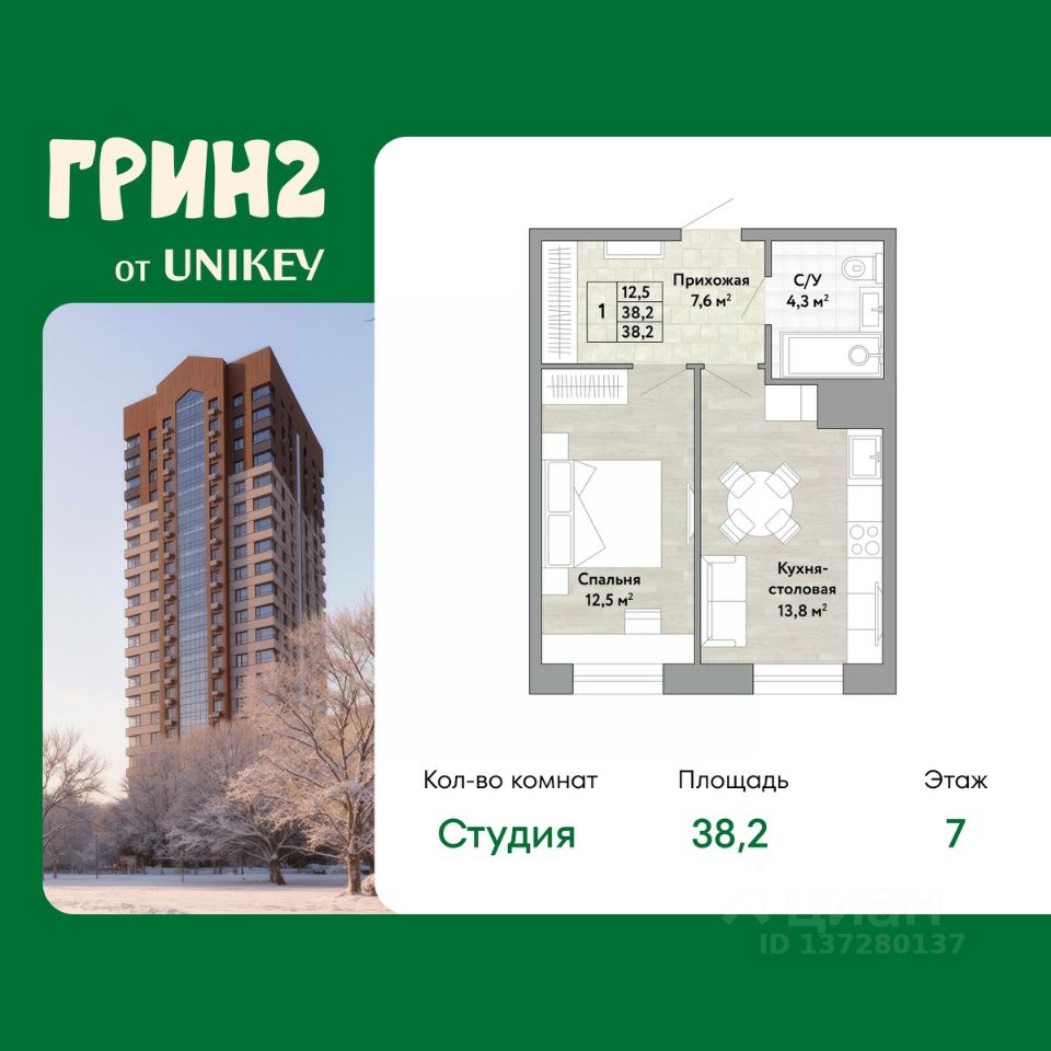 Продается однокомнатная квартира в ЖК "Грин 2" на 7 этаже. Квартира без отделки, полностью готова к ремонту. Общая площадь: 38.2 кв.м., жилая: 12.5 кв.м., площадь просторной кухни-столовой: 13.8 кв.м. Все окна выходят на одну сторону. В квартире один совмещенный санузел. Высота потолков 2.7 м.