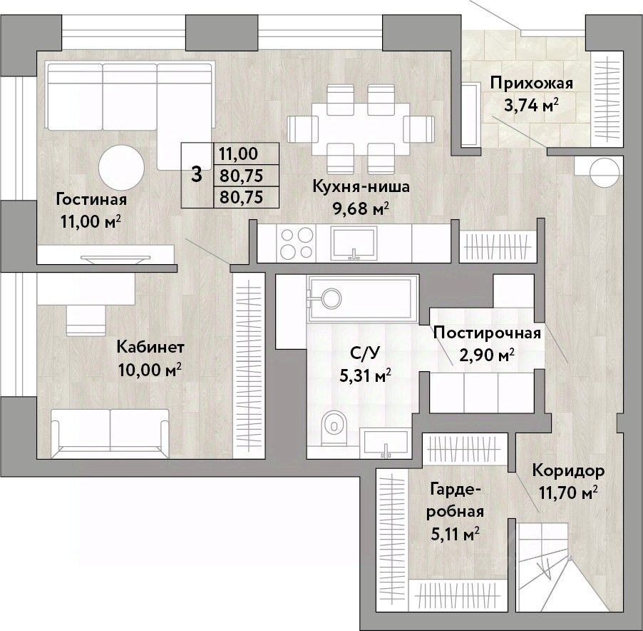 Просторная 3-комн. квартира с предчистовой отделкой в ЖК "Stories" на 1 этаже. Общая площадь: 80.75 кв.м. Высота потолков 2.9 м.