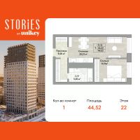 Просторная 1-комн. квартира с предчистовой отделкой в ЖК "Stories" на 22 этаже. Общая площадь: 44.52 кв.м., жилая: 11.13 кв.м., площадь просторной кухни-столовой: 20.31 кв.м. Все окна выходят на одну сторону. В квартире один совмещенный санузел. Высота потолков 2.9 м.