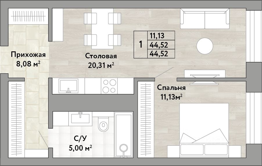 Продается однокомнатная квартира с предчистовой отделкой в ЖК "Stories" на 18 этаже. Общая площадь: 44.52 кв.м., жилая: 11.13 кв.м., площадь просторной кухни-столовой: 20.31 кв.м. Все окна выходят на одну сторону. В квартире один совмещенный санузел. Высота потолков 2.9 м.