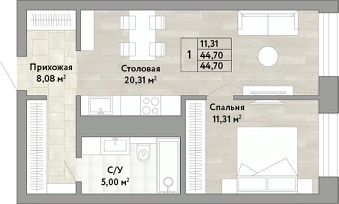 Продается 1-комн. квартира с предчистовой отделкой в ЖК "Stories" на 14 этаже. Общая площадь: 44.7 кв.м., жилая: 11.31 кв.м., площадь просторной кухни-столовой: 20.31 кв.м. Все окна выходят на одну сторону. В квартире один совмещенный санузел. Высота потолков 2.9 м.