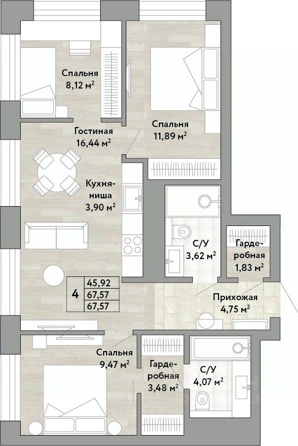 Четырехкомнатная квартира с европланировкой и предчистовой отделкой в ЖК "Stories" на 21 этаже. Общая площадь: 67.57 кв.м., жилая: 45.92 кв.м., общая площадь гостиной-столовой с кухонной зоной: 20.34 кв.м. Европейская планировка, зона гостиной комнаты объединена с кухней. Квартира угловая, идеально подойдет любителям тишины и панорамных видов. В квартире два совмещенных санузла. Высота потолков 2.9 м.