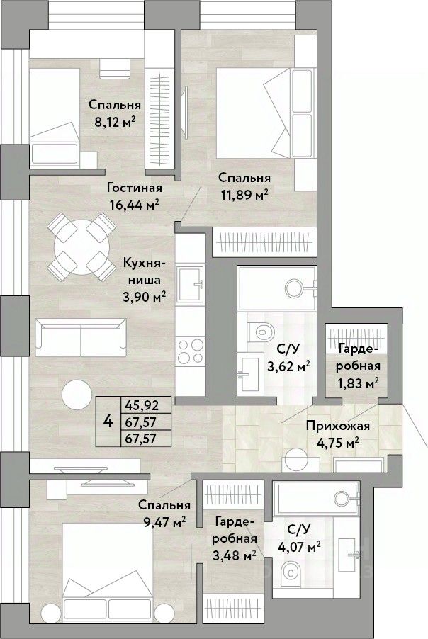 Продается четырехкомнатная квартира с европланировкой и предчистовой отделкой в ЖК "Stories" на 22 этаже. Общая площадь: 67.57 кв.м., жилая: 45.92 кв.м., суммарная площадь гостиной-столовой с кухонной зоной: 20.34 кв.м. Европейская планировка, за счет большой площади кухни-гостиной квартира выглядит просторной и очень удобна для жизни. Квартира угловая, очень светлая, естественная вентиляция при открытии окон. В квартире два совмещенных санузла. Высота потолков 2.9 м.