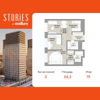 3-комн. квартира с европланировкой от застройщика в ЖК "Stories" на 19 этаже. Квартира без отделки, новый владелец может сделать ремонт по своему проекту. Общая площадь: 54.2 кв.м., жилая: 35.91 кв.м., общая площадь гостиной-столовой с кухонной зоной: 21.01 кв.м. Европейская планировка, за счет большой площади кухни-гостиной квартира выглядит просторной и очень удобна для жизни. Комнаты изолированные, все окна выходят на одну сторону. В квартире два совмещенных санузла. Высота потолков 2.9 м.