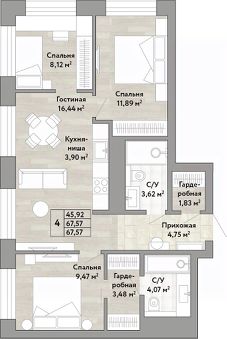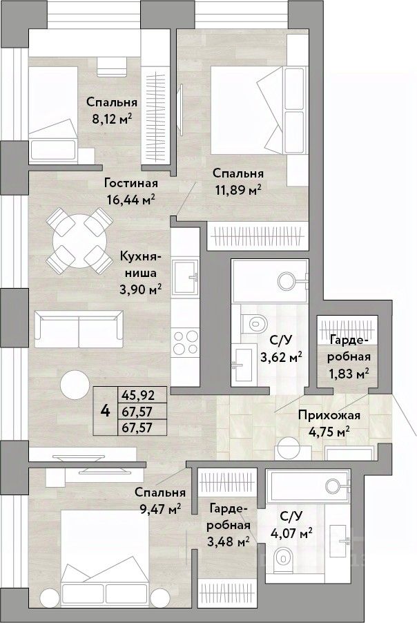 Продается 4-комн. квартира с европланировкой и предчистовой отделкой в ЖК "Stories" на 19 этаже. Общая площадь: 67.57 кв.м., жилая: 45.92 кв.м., суммарная площадь гостиной-столовой с кухонной зоной: 20.34 кв.м. Европейская планировка, за счет большой площади кухни-гостиной квартира выглядит просторной и очень удобна для жизни. Угловая квартира, очень светлая, естественная вентиляция при открытии окон. В квартире два совмещенных санузла. Высота потолков 2.9 м.