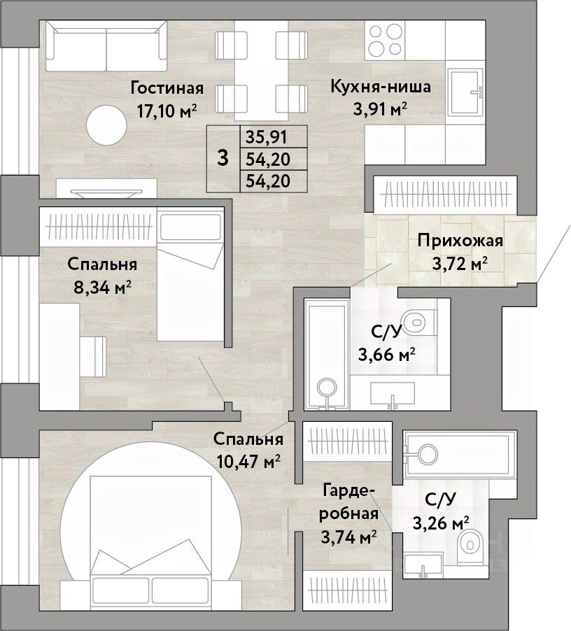 Продается трехкомнатная квартира с европланировкой и предчистовой отделкой в ЖК "Stories" на 20 этаже. Общая площадь: 54.2 кв.м., жилая: 35.91 кв.м., суммарная площадь гостиной-столовой с кухонной зоной: 21.01 кв.м. Европейская планировка, за счет большой площади кухни-гостиной квартира выглядит просторной и очень удобна для жизни. Комнаты изолированные, все окна выходят на одну сторону. В квартире два совмещенных санузла. Высота потолков 2.9 м.