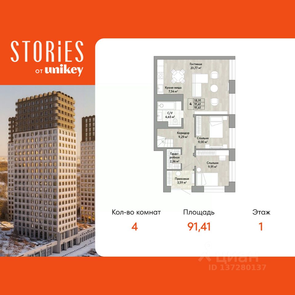 Просторная четырехкомнатная квартира с европланировкой и предчистовой отделкой в ЖК "Stories" на 1 этаже. Двухуровневая квартира, на каждом этаже вы можете выделить различные функциональные зоны. Общая площадь: 91.41 кв.м., жилая: 49.68 кв.м., общая площадь гостиной-столовой с кухонной зоной: 28.31 кв.м. Европланировка, за счет большой площади кухни-гостиной квартира выглядит просторной и очень удобна для жизни. Квартира угловая, очень светлая, естественная вентиляция при открытии окон. В квартире один совмещенный санузел. Высота потолков 2.9 м.