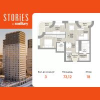 3-комн. квартира с европланировкой и предчистовой отделкой в ЖК "Stories" на 18 этаже. Общая площадь: 73.12 кв.м., жилая: 42.84 кв.м., суммарная площадь гостиной-столовой с кухонной зоной: 26.97 кв.м. Европейская планировка, площадь комнат позволяет разместить в них все необходимое, а в просторной кухне-гостиной удобно как готовить, так и отдыхать. Угловая квартира, очень светлая, естественная вентиляция при открытии окон. В квартире две лоджии, два совмещенных санузла. Высота потолков 2.9 м.