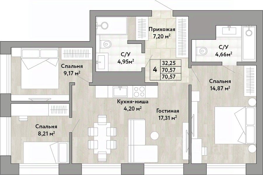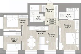 Просторная 4-комн. квартира с предчистовой отделкой в ЖК "Stories" на 2 этаже. Общая площадь: 70.57 кв.м. Высота потолков 2.9 м.