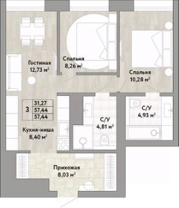 3-комн. квартира с европланировкой и предчистовой отделкой в ЖК "Stories" на 7 этаже. Общая площадь: 57.44 кв.м., жилая: 31.27 кв.м., суммарная площадь гостиной-столовой с кухонной зоной: 21.13 кв.м. Европейская планировка, за счет большой площади кухни-гостиной квартира выглядит просторной и очень удобна для жизни. Комнаты изолированные, все окна выходят на одну сторону. В квартире два совмещенных санузла. Высота потолков 2.9 м.