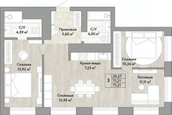 Продается трехкомнатная квартира с европланировкой и предчистовой отделкой в ЖК "Stories" на 7 этаже. Общая площадь: 71.21 кв.м., жилая: 38.97 кв.м., суммарная площадь гостиной-столовой с кухонной зоной: 21.2 кв.м. Европланировка, площадь комнат позволяет разместить в них все необходимое, а в просторной кухне-гостиной удобно как готовить, так и отдыхать. Угловая квартира, идеально подойдет любителям тишины и панорамных видов. В квартире два совмещенных санузла. Высота потолков 2.9 м.