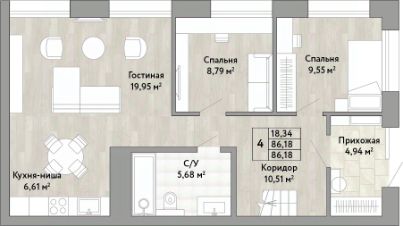4-комн. квартира с предчистовой отделкой в ЖК "Stories" на 1 этаже. Общая площадь: 86.18 кв.м. Высота потолков 2.9 м.