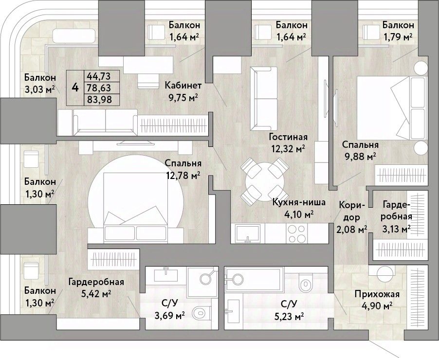 Просторная четырехкомнатная квартира с европланировкой и предчистовой отделкой в ЖК "Stories" на 20 этаже. Общая площадь: 78.63 кв.м., жилая: 44.73 кв.м., общая площадь гостиной-столовой с кухонной зоной: 16.42 кв.м. Европейская планировка, зона гостиной комнаты объединена с кухней. Угловая квартира, идеально подойдет любителям тишины и панорамных видов. В квартире три балкона, два совмещенных санузла. Высота потолков 2.9 м.