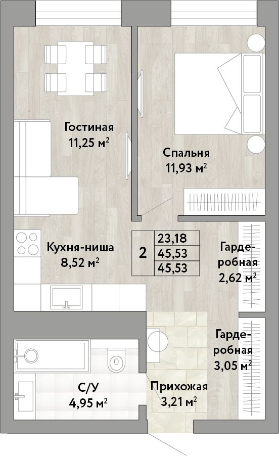 Двухкомнатная квартира с европланировкой и предчистовой отделкой в ЖК "Stories" на 13 этаже. Общая площадь: 45.53 кв.м., жилая: 23.18 кв.м., суммарная площадь гостиной-столовой с кухонной зоной: 19.77 кв.м. Европланировка, за счет большой площади кухни-гостиной квартира выглядит просторной и очень удобна для жизни. Комнаты изолированные, все окна выходят на одну сторону. В квартире один совмещенный санузел. Высота потолков 2.9 м.
