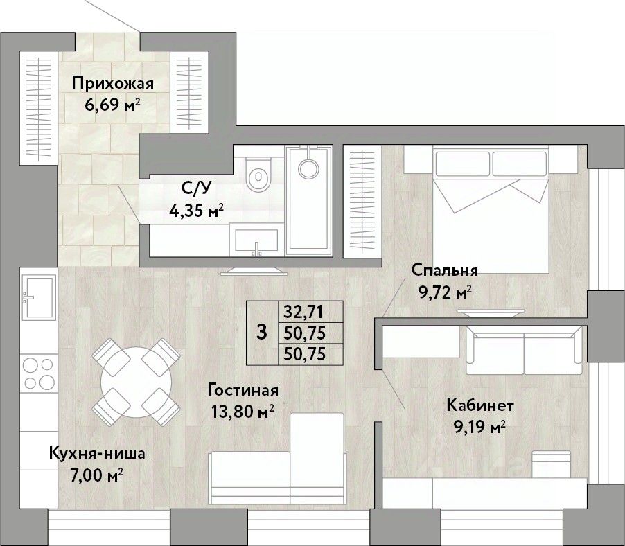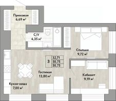 Продается трехкомнатная квартира с европланировкой и предчистовой отделкой в ЖК "Stories" на 15 этаже. Общая площадь: 50.75 кв.м., жилая: 32.71 кв.м., суммарная площадь гостиной-столовой с кухонной зоной: 20.8 кв.м. Европланировка, зона гостиной комнаты объединена с кухней. Квартира угловая, очень светлая, естественная вентиляция при открытии окон. В квартире один совмещенный санузел. Высота потолков 2.9 м.