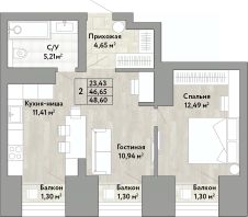 2-комн. квартира от застройщика с предчистовой отделкой в ЖК "Stories" на 18 этаже. Общая площадь: 46.65 кв.м., жилая: 23.43 кв.м., площадь просторной кухни-столовой: 11.41 кв.м. Комнаты изолированные, все окна выходят на одну сторону. В квартире три балкона, один совмещенный санузел. Высота потолков 2.9 м.